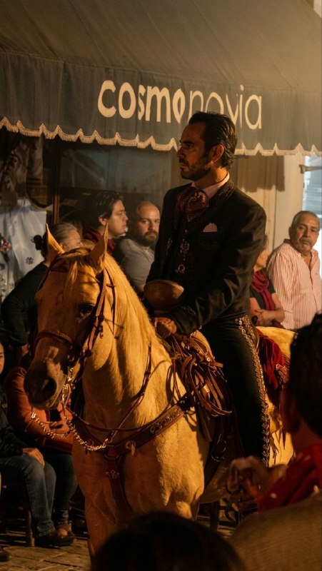 Imagina el ambiente: la noche cae sobre el centro histórico, y el sonido de los tambores empieza a marcar un ritmo solemne. Antes de que el silencio se apodere de las calles, la elegancia se hace presente. En esta imagen, capturamos a un charro potosino, con su traje impecable y su caballo palomino, un recordatorio de que esta tradición está profundamente arraigada en la cultura local.