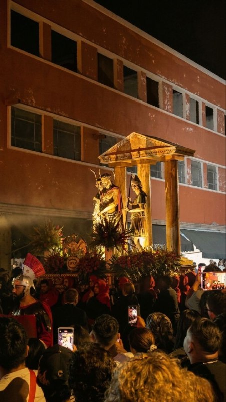 El momento culminante llega cuando las imágenes religiosas, portadas por los cofrades, recorren las calles. La figura de Cristo, como la que vemos en esta fotografía, es el corazón de la procesión. Su expresión de dolor y redención conmueve a los miles de asistentes, que observan con respeto y devoción.